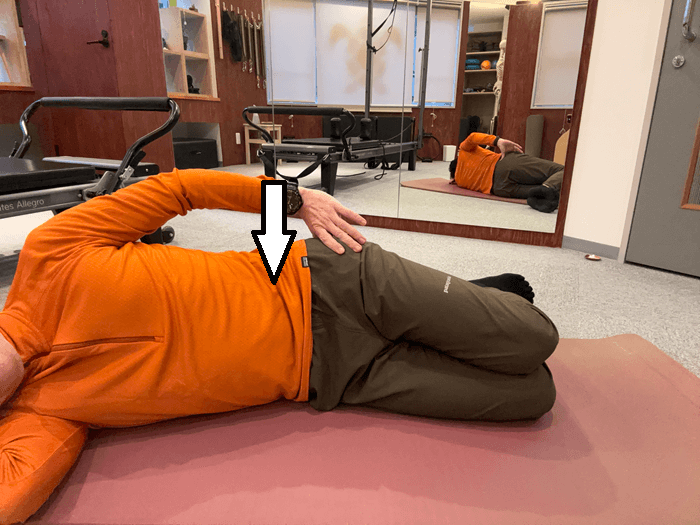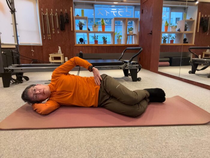 - マットに横向きで寝ます(両膝を揃えた状態)。