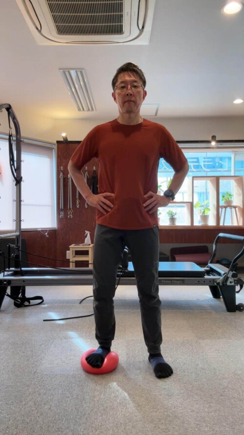 1.空気を少し抜いたピラティスボールを片足で踏み、腰幅よりやや広めに立つ。